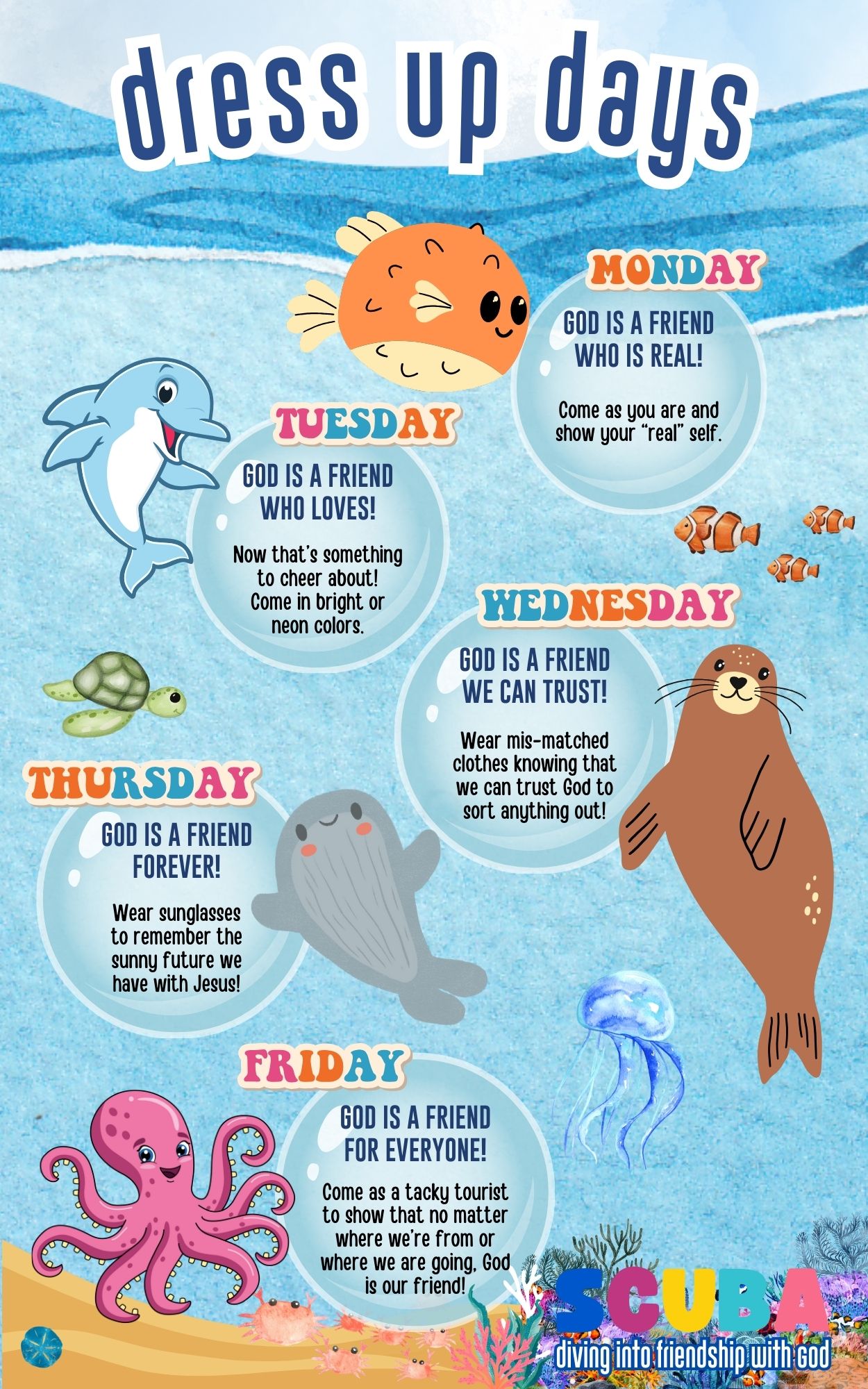 Not every church is up for getting t-shirts for all the kids. As fun as matching shirts can be, they are a big expense. Another option is to go with themed dress-up days. As a mom, I always prefer that dress-up days are kept relatively simple so we’re not running to Target at 10 p.m. the night before a camp day! And, of course, the simple themes should enhance the kids’ experience rather than distract them from what’s important. Here is a sample with some ideas.