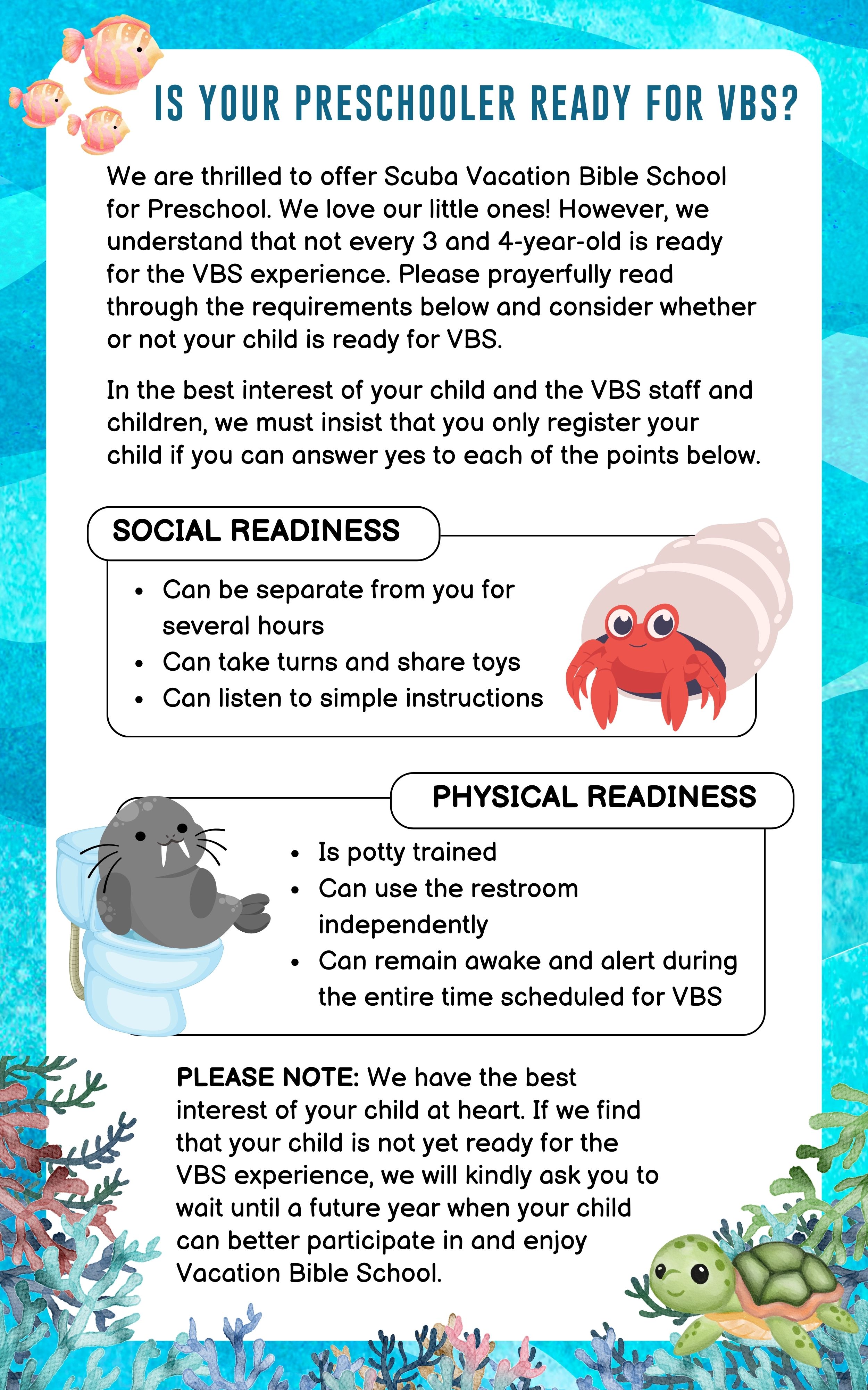 PRESCHOOL READINESS FORM What is the youngest age we should allow to come to VBS? That’s a question many a director has grappled with…prayed about…discussed with their team and pastor…and then grappled with some more! We love our little ones and want them to be exposed to the message of Jesus as young as possible. We also know that families with multiple children want their preschoolers to be able to participate. Yet volunteer force and resources are a barrier for some churches to be able to provide VBS to younger children. Further, we all know that kids that aren’t ready physically, emotionally, or socially will struggle at VBS and can also hinder other children from learning. Bottom line…there is clearly no right or wrong answer to this question. Pray…consider…pray…discuss…pray some more…decide. You’ve got your answer for what’s right for your church!